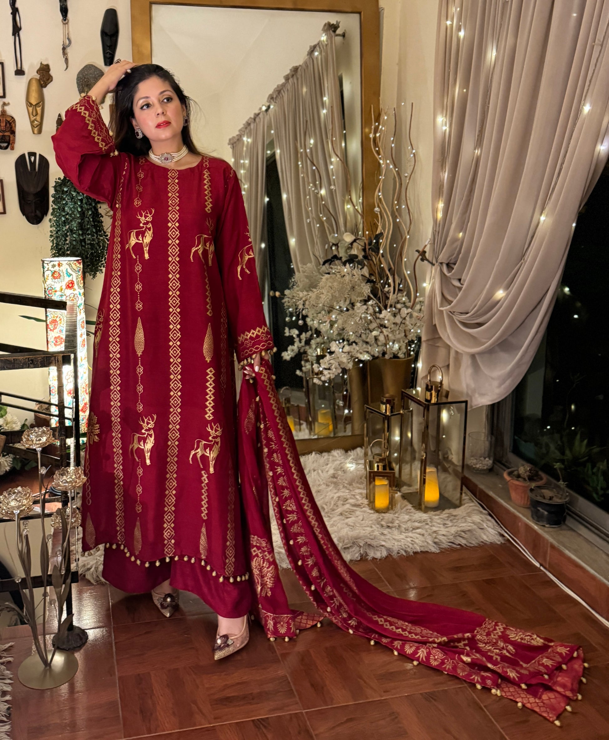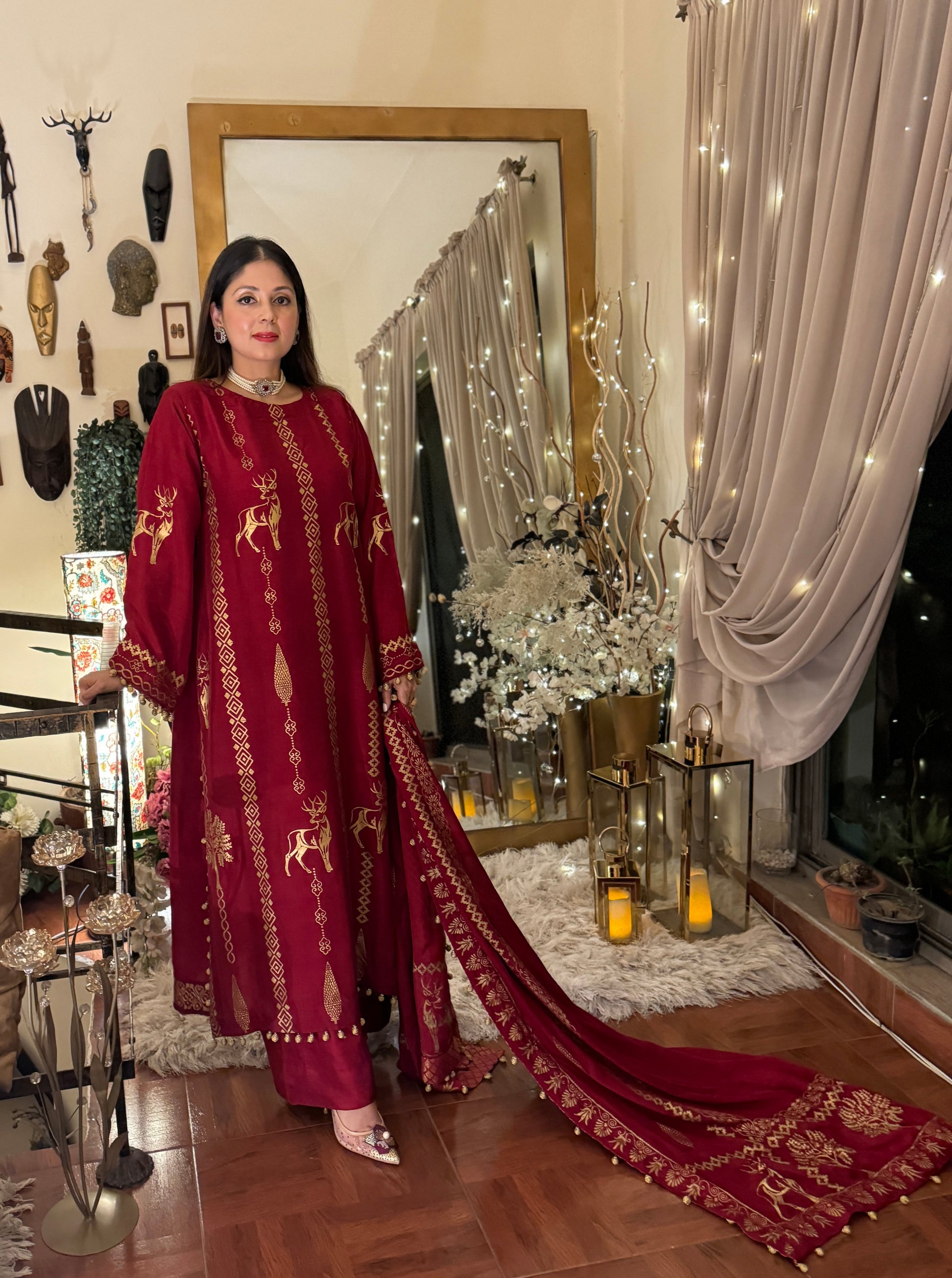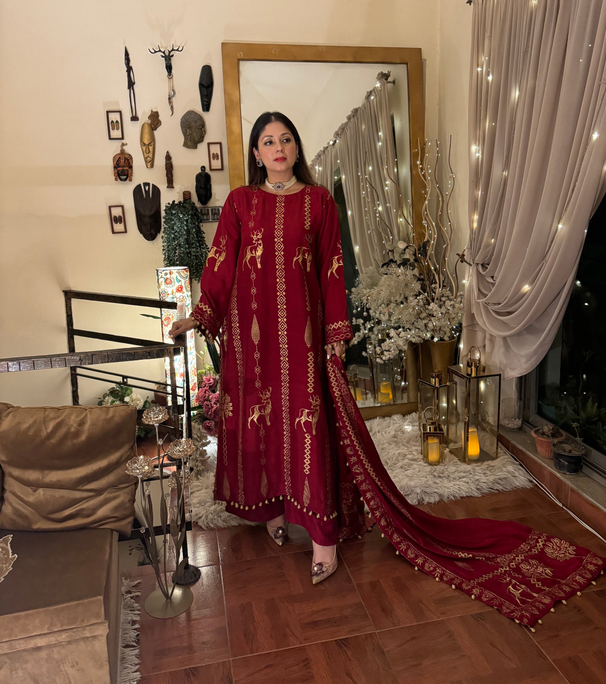 "A deep maroon canvas adorned with regal gold block printing, this ensemble captures the essence of timeless luxury. Inspired by cultural artistry, the kameez is meticulously designed with heritage motifs — delicate deer, stylized foliage, and geometric patterns that speak of tradition reimagined.
