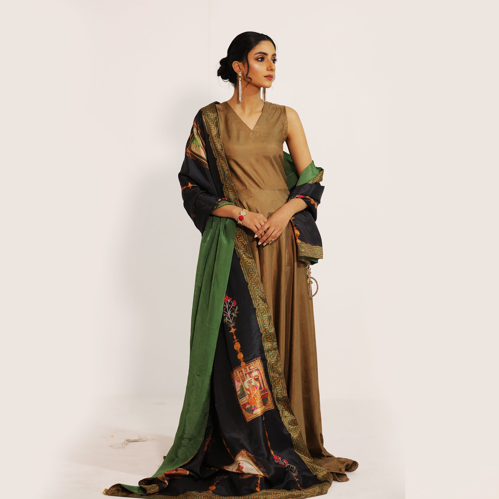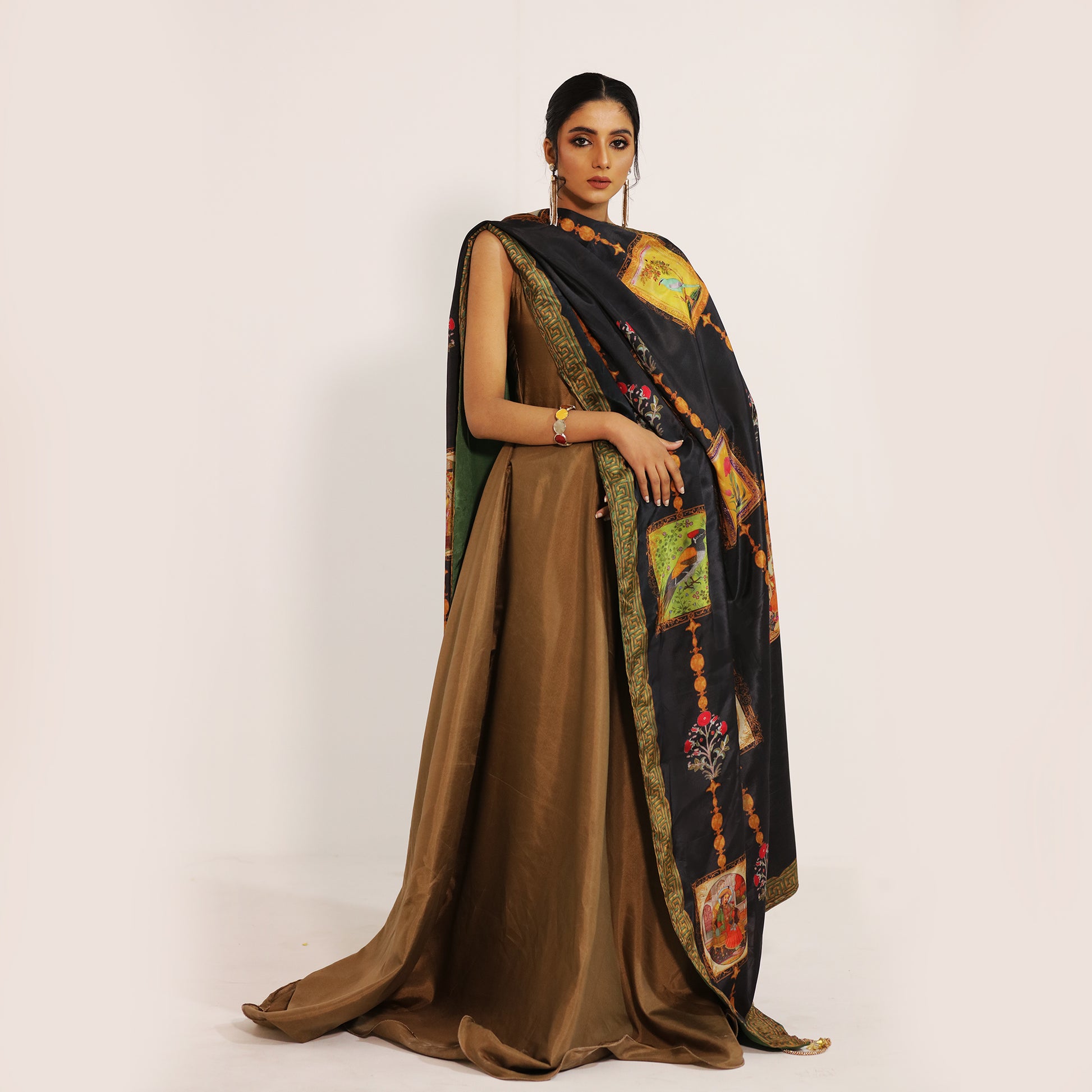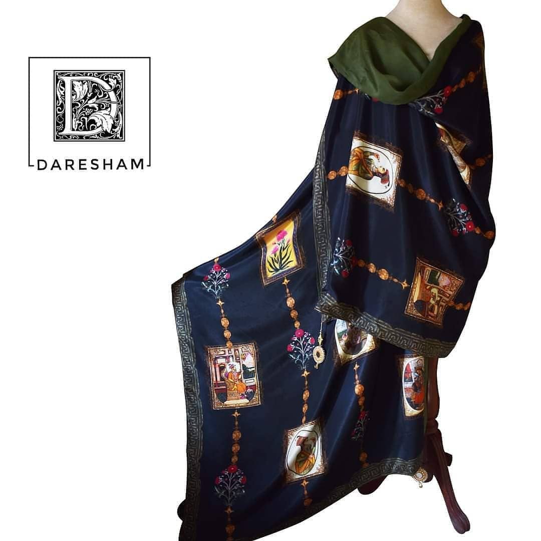 It is a matte grip silk digitally printed reversible shawl embellished with tassels on four corners length is approximately 3 yards.